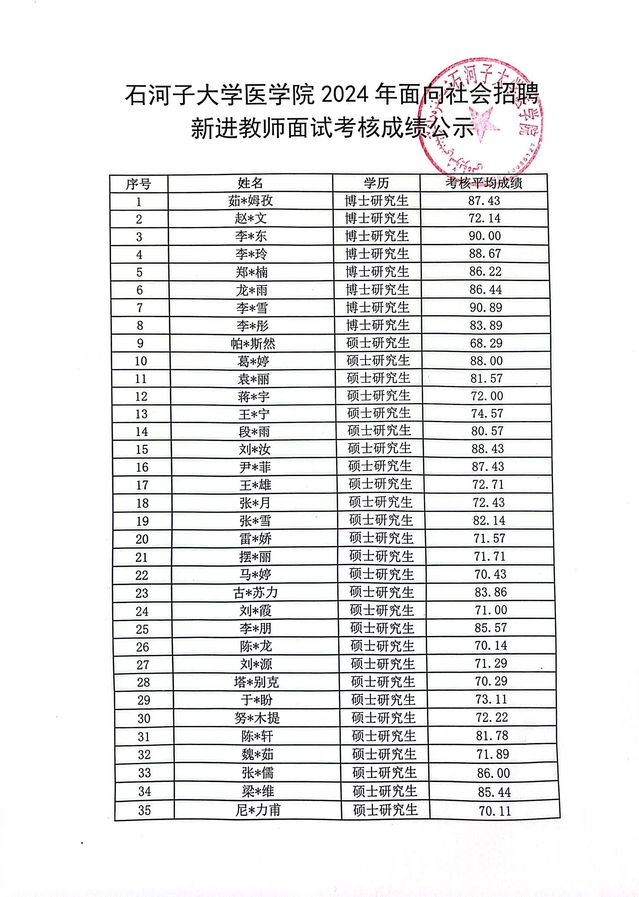 石河子大學(xué)醫(yī)學(xué)院2024年面向社會(huì)招聘新進(jìn)教師面試考核成績(jī)公示