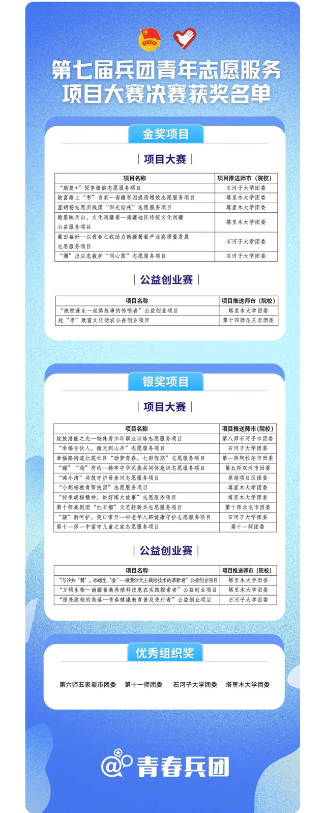 9月4日-5日,第七屆兵團青年志愿服務項目大賽決賽暨志愿服務交流會在五家渠市圓滿閉幕。我院選送的三個志愿服務項目經過激烈角逐,最終喜獲兩金一銀的優(yōu)異成績,展現了我院青年志愿者的卓越風采和專業(yè)能力。
