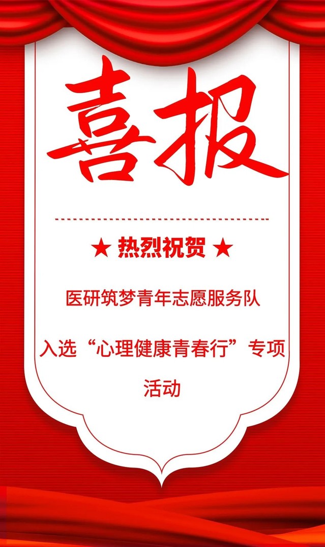 為加強青少年心理健康守護工作,共青團中央維護青少年權益部、中國青年報社擬開展“三下鄉(xiāng)”社會實踐之“心理健康青春行”專項活動,動員高校學生聚焦開展心理知識科普、志愿服務、專題調研等活動,幫助青少年提升心理素養(yǎng)。各地高校師生積極參與,共計1389支團隊報名,最終遴選團隊104支,我校醫(yī)學院1支志愿服務團隊入選。