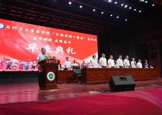 石河子大學(xué)黨委常委、副校長,醫(yī)學(xué)院黨委書記吳向未、石河子大學(xué)第一附屬醫(yī)院院長徐江、石河子大學(xué)研究生院副院長李新芝、醫(yī)學(xué)院院長馬克濤及全體院領(lǐng)導(dǎo)、各系辦主任、輔導(dǎo)員、班主任出席了此次典禮。此次典禮由醫(yī)學(xué)院黨委副書記于磊主持。