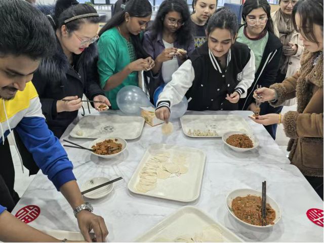活動中,一場別開生面的包餃子環(huán)節(jié)將氣氛推向高潮。餃子作為中華傳統(tǒng)飲食文化的重要象征,承載著團(tuán)圓與美好祝愿。老師們親自上手,手把手教留學(xué)生們包餃子。從搟面皮、放餡料,到捏褶子,每一個步驟都充滿了樂趣。留學(xué)生們積極參與,盡管手法有生疏又熟練,但都樂在其中。有的包出的餃子形狀各異,充滿創(chuàng)意;有的同學(xué)則包得有模有樣,令人稱贊。手藝稍好的同學(xué)還主動當(dāng)起了“小老師”,耐心指導(dǎo)身邊的小伙伴,在一來一往的交流互動中,大家的情誼愈發(fā)深厚。