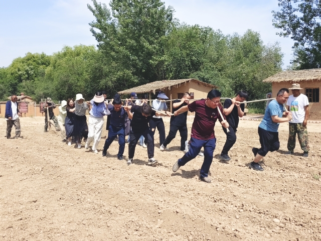 在墾荒體驗(yàn)區(qū),老師們躍躍欲試,紛紛參與體驗(yàn)開(kāi)墾勞動(dòng),兩列隊(duì)伍俯身弓步,拿起犁繩扛在肩頭,將插在土里的犁鏵不斷拉向前進(jìn),沉浸式感受人拉肩扛,這是兵團(tuán)人來(lái)時(shí)的路,烈日當(dāng)空也難掩老師們的熱情。