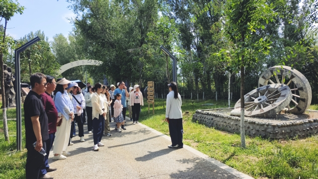 在講解員的引導(dǎo)下,黨員教師們參觀了打夯、拉犁、打井等雕塑群以及地窩子、干打壘等充滿革命色彩的建筑。陳列室里的放映機(jī)、老式喇叭、農(nóng)具等歷史物件以及團(tuán)部禮堂內(nèi)一張張黑白照片,都在訴說(shuō)著老一輩兵團(tuán)人艱苦創(chuàng)業(yè)的故事。