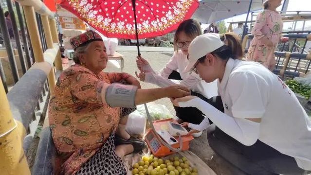 活動結(jié)束之際,同學(xué)們手持血壓測量儀走進(jìn)巴扎,給那些不便前來的攤主測量血壓。“聽到有人說你們那邊免費(fèi)量血壓,我還挺想去的,可惜我這有攤子要看,還以為要錯過了,沒想到你們過來給我們量,真貼心。”賣杏子的攤主道。