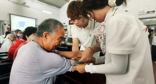 來自臨床醫(yī)學(xué)專業(yè)的張凱悅、伍倩、斯嚴慧瑜三位隊員化身“健康使者”,以專業(yè)的素養(yǎng)和滿懷關(guān)愛的心,為老人們進行健康知識講解。