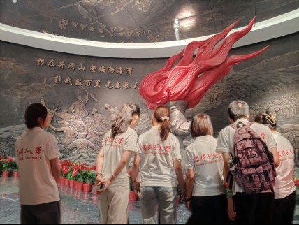 實踐團成員進入紀念館大廳,沿著地面上的時間軸線探究紅色基因的孕育和起源。正前方是一枚火炬,墻面四幅巨大的浮雕形象地詮釋了時間軸線上四個重要歷史時期發(fā)生的歷史事件,也是“根在井岡山,整編渤海灣;轉(zhuǎn)戰(zhàn)數(shù)萬里,屯墾在天山”的畫面圖解。