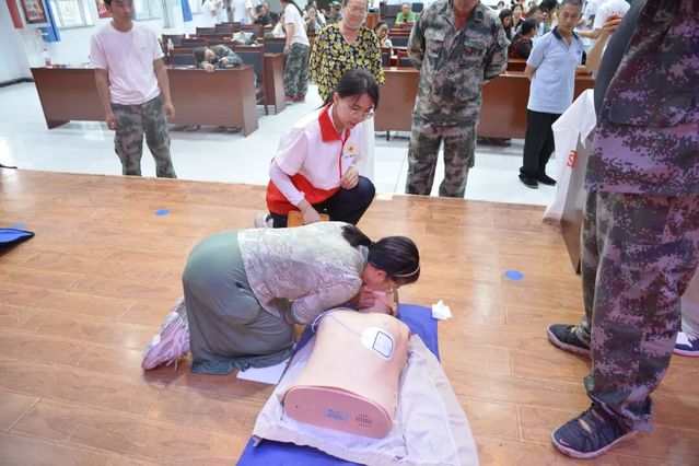 緊接著,急救技能宣講在連部活動(dòng)中心展開。隊(duì)員以標(biāo)準(zhǔn)分解動(dòng)作演示心肺復(fù)蘇全流程——從判斷意識(shí)、定位按壓點(diǎn)到開放氣道、人工呼吸,同步解析“按壓深度不足”“吹氣過量”等致命誤區(qū)。演示剛剛結(jié)束,已有居民主動(dòng)舉手申請(qǐng)實(shí)操。“手臂要垂直!”“按壓節(jié)奏保持100~120次/分!”隊(duì)員半跪于地,手把手校準(zhǔn)每位操作者姿勢(shì)力道。當(dāng)兩位居民成功完成規(guī)范流程,全場(chǎng)掌聲雷動(dòng)。這場(chǎng)沉浸式教學(xué)讓居民深刻領(lǐng)悟:急救技能并非遙不可及的專業(yè)壁壘,而是每個(gè)家庭都應(yīng)掌握的生命密鑰。