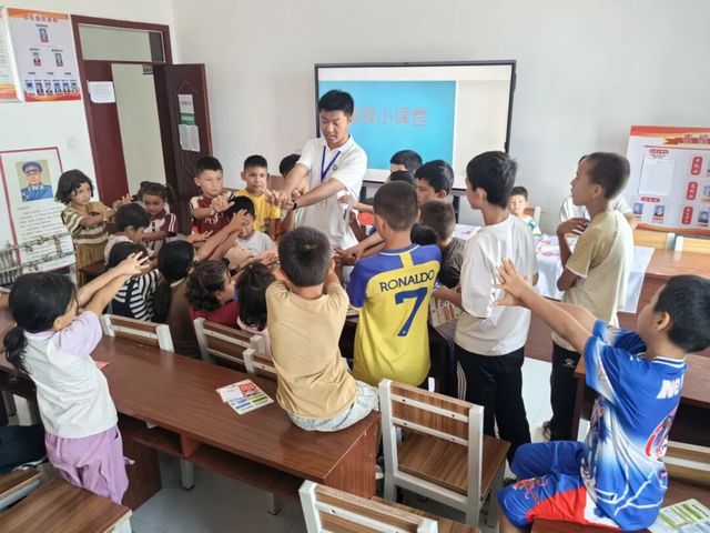 團隊前往八連夏河鎮(zhèn),走訪連隊居民,進行政策宣傳、義務測血壓。針對連隊大人忙于農活無暇照護孩子的情況,團隊化身“小老師”,為孩子們開展衛(wèi)生科普、急救技能、防溺水安全教育、云“逛”石大等特色課程,將健康與教育服務延伸至基層“最后一公里”。