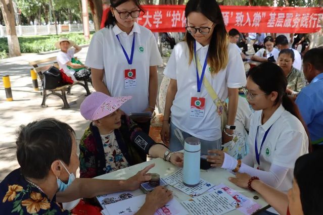 圖為實踐團在第三師御景苑社區(qū)廣場配合衛(wèi)生員做宮頸癌認知調研及提供健康測血壓服務