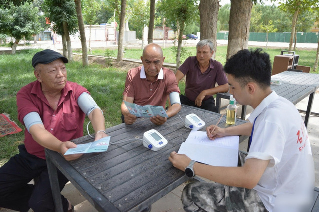 圖為“輕‘脂’為綱,‘慢’減興疆”實(shí)踐團(tuán)成員走進(jìn)社區(qū)為中老年人量血壓