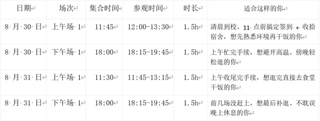 按你方便的場次,提前 10 分鐘到集合點,找學(xué)長簽到就能加入隊伍~想和室友、同班同學(xué)一起?約好同一場次,組隊逛更開心!