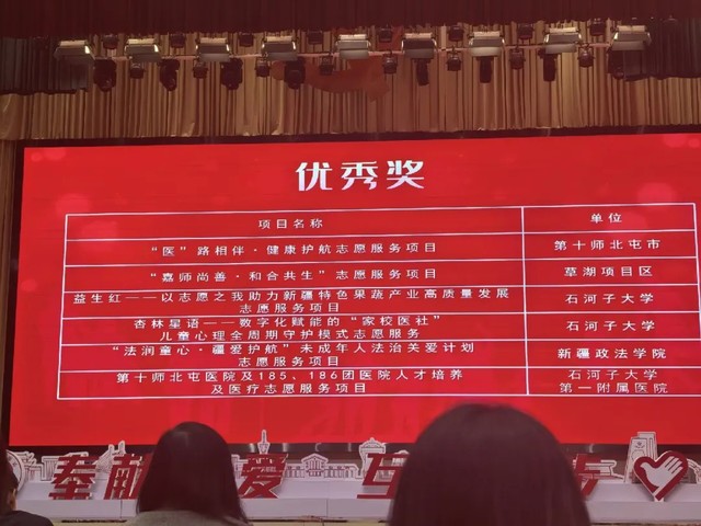 11月9日—12日,新疆生產(chǎn)建設(shè)兵團(tuán)志愿服務(wù)項目大賽決賽在烏魯木齊市圓滿舉行,共計60個項目在決賽中交流展示,學(xué)院“彩虹守護(hù)計劃 —— 禁毒防艾,向陽而行” 項目斬獲銀獎,“杏林星語 —— 數(shù)字化賦能的‘家校醫(yī)社’兒童心理全周期守護(hù)模式” 項目榮獲優(yōu)秀獎。
