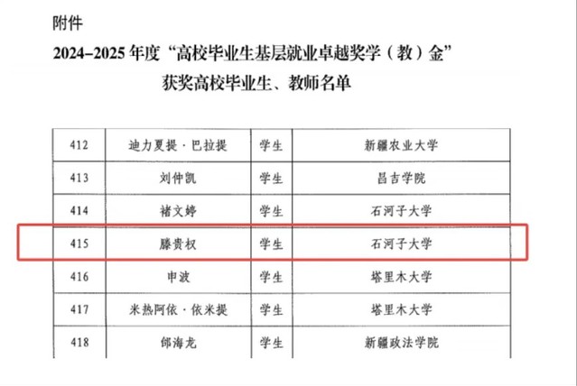 近日,教育部高校學(xué)生司聯(lián)合中國教育發(fā)展基金會(huì)公布2024-2025年度“高校畢業(yè)生基層就業(yè)卓越獎(jiǎng)學(xué)(教)金”獲獎(jiǎng)名單,我院2019屆本科畢業(yè)生滕貴權(quán)憑借在基層崗位的突出業(yè)績光榮入選。該獎(jiǎng)項(xiàng)由教育部高校學(xué)生司指導(dǎo)、中國長江三峽集團(tuán)出資設(shè)立,全國僅418名畢業(yè)生獲此殊榮,滕貴權(quán)的獲獎(jiǎng)既是個(gè)人奮斗的勛章,更是我院“扎根基層、服務(wù)社會(huì)”育人理念的生動(dòng)彰顯。