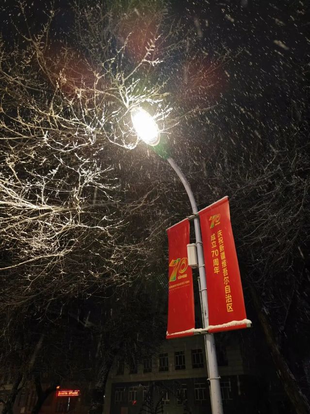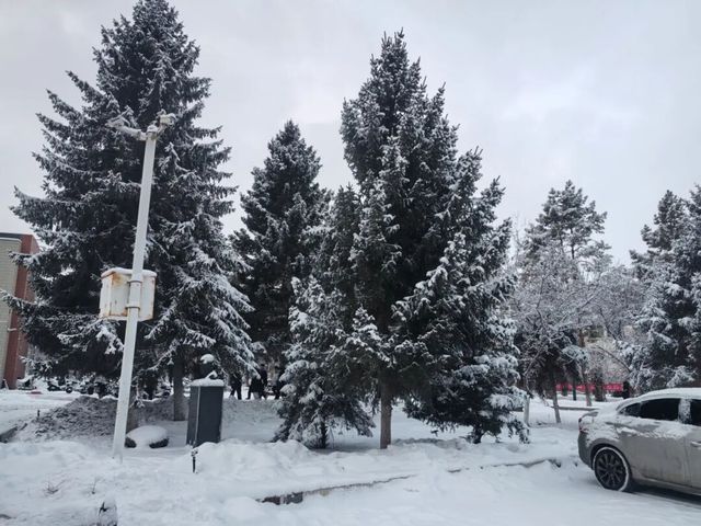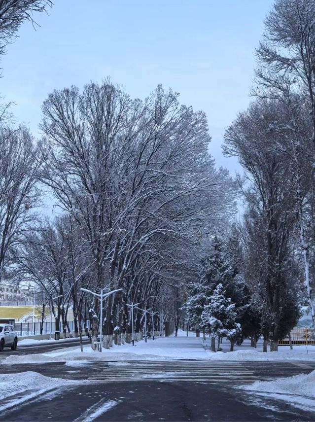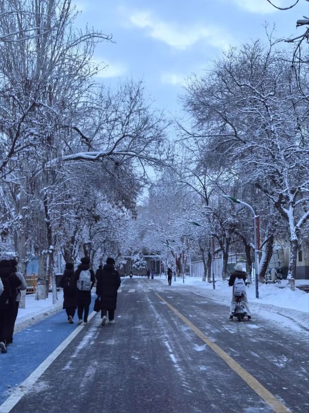 推開(kāi)宿舍門(mén)的那一刻,世界突然安靜下來(lái):往日喧鬧的林蔭道,此刻鋪滿了厚厚的雪,像一條柔軟的白色絨毯;路邊的榆樹(shù),枝椏上掛著蓬松的雪團(tuán),風(fēng)一吹,便有細(xì)碎的雪沫簌簌落下,落在肩頭,涼絲絲的。