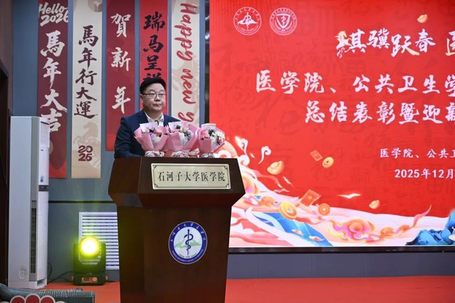 2025年12月31日下午,“騏驥躍春,醫(yī)啟新程”醫(yī)學(xué)院、公共衛(wèi)生學(xué)院2025年工作總結(jié)表彰暨迎新年團(tuán)拜會(huì)在南區(qū)學(xué)術(shù)報(bào)告廳隆重舉行。北京大學(xué)公共衛(wèi)生學(xué)院副院長(zhǎng)、石河子大學(xué)醫(yī)學(xué)院、公共衛(wèi)生學(xué)院特聘教授王海俊,石河子大學(xué)教務(wù)處處長(zhǎng)李思源等醫(yī)學(xué)導(dǎo)師、石河子大學(xué)第一附屬醫(yī)院(臨床醫(yī)學(xué)院)、石河子大學(xué)附屬中醫(yī)醫(yī)院(兵團(tuán)中醫(yī)醫(yī)院)、石河子大學(xué)醫(yī)學(xué)院第三附屬醫(yī)院(第八師石河子市總醫(yī)院)等附屬單位領(lǐng)導(dǎo)嘉賓以及醫(yī)學(xué)院、公共衛(wèi)生學(xué)院領(lǐng)導(dǎo)班子成員和全體教職工齊聚一堂,共憶耕耘歲月,共話發(fā)展藍(lán)圖,共度辭舊迎新美好時(shí)刻。