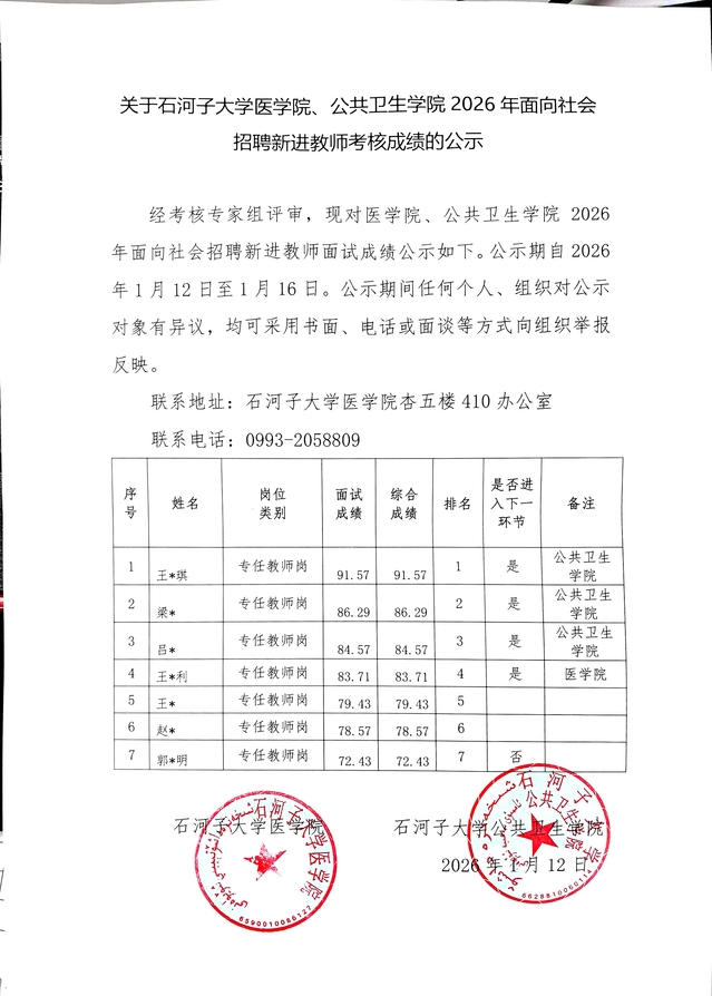 關(guān)于石河子大學(xué)醫(yī)學(xué)院、公共衛(wèi)生學(xué)院2026年面向社會招聘新進(jìn)教師考核成績的公示