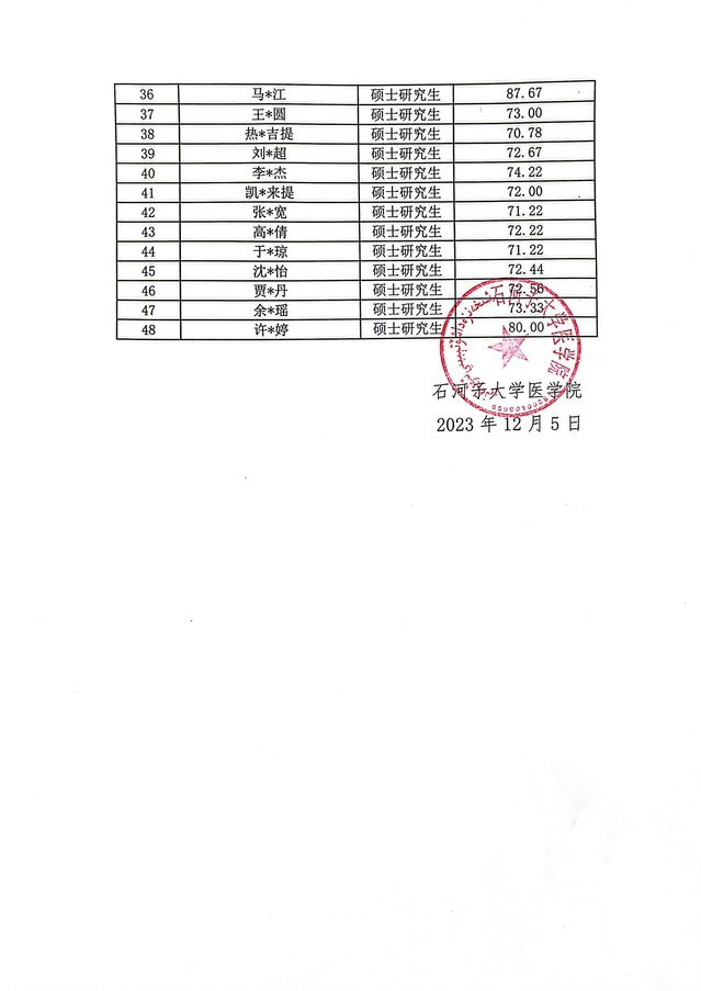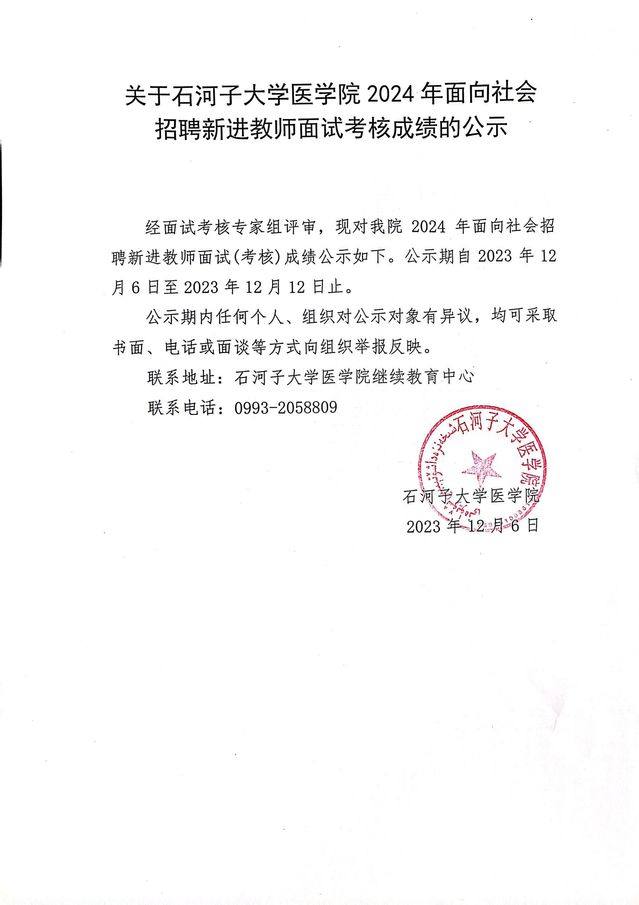 石河子大學(xué)醫(yī)學(xué)院2024年面向社會(huì)招聘新進(jìn)教師面試考核成績(jī)公示