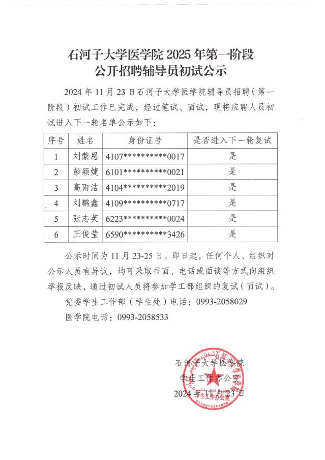 石河子大學(xué)醫(yī)學(xué)院2025年第一階段公開招聘輔導(dǎo)員初試公示