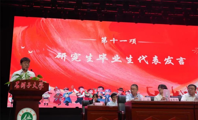 大會第十一項 研究生畢業(yè)生代表孫立明發(fā)言。他用石大是“港灣”是“舞臺”回顧了在石河子大學醫(yī)學院求學的數(shù)載。分享了他通過重重考核成功入職開啟自己“打工人”之旅的背后,是感恩母校為莘莘學子提供了系統(tǒng)的醫(yī)學教育、扎實的科研訓練,以及探索專業(yè)領域以外的平臺和機會。