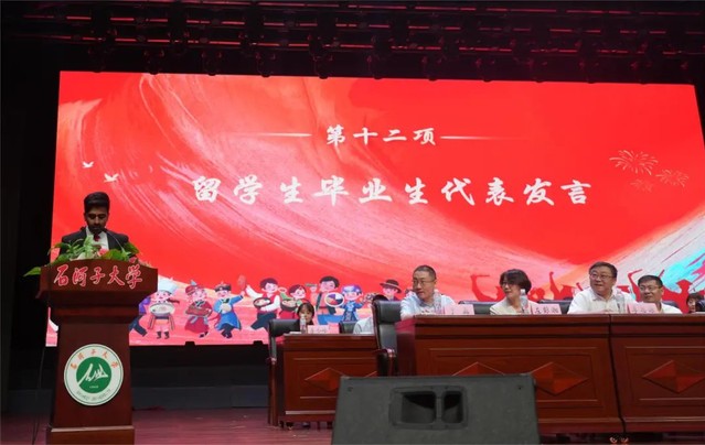 大會第十二項 留學(xué)生畢業(yè)生代表帕里斯發(fā)言。流利的中文自我介紹,收獲了臺下充滿祝福的掌聲。獨在異鄉(xiāng)為異客,感謝石河子大學(xué)醫(yī)學(xué)院老師同學(xué)們的幫助,祝賀2024屆畢業(yè)生們都能在醫(yī)療衛(wèi)生事業(yè)中發(fā)光發(fā)熱,不忘老師的教誨,做一個高尚的醫(yī)務(wù)工作者。