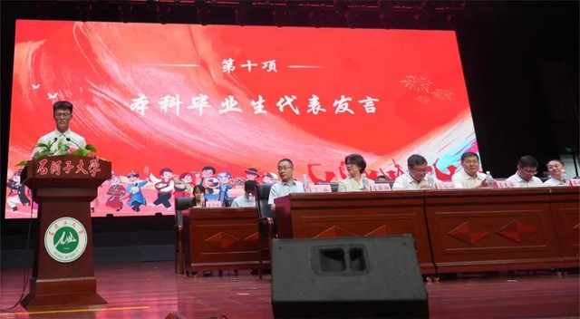 大會第十項 本科畢業(yè)生代表杜威發(fā)言。他用“感動、感謝、感恩”作為主題詞,講述了他與石大醫(yī)學(xué)院邂逅的故事,他號召各位畢業(yè)生朋友們在未來不斷學(xué)習(xí)積極進(jìn)取,為祖國的醫(yī)學(xué)事業(yè)貢獻(xiàn)力量,同時祝福老師們身體健康、工作順利,祝愿母校人才輩出、永續(xù)華章。