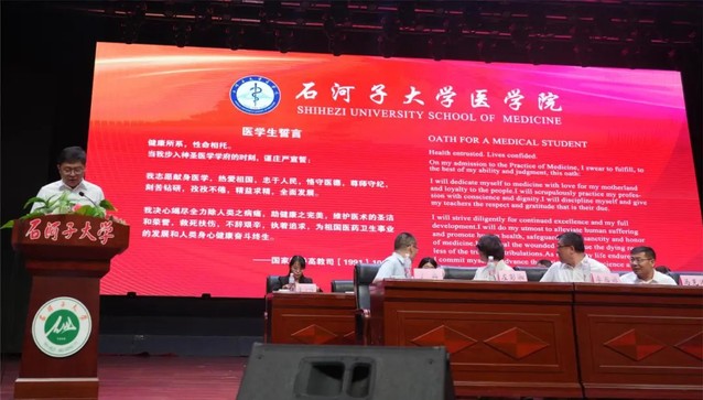 石河子大學(xué)黨委常委、副校長,醫(yī)學(xué)院黨委書記吳向未、石河子大學(xué)第一附屬醫(yī)院院長徐江、石河子大學(xué)研究生院副院長李新芝、醫(yī)學(xué)院院長馬克濤及全體院領(lǐng)導(dǎo)、各系辦主任、輔導(dǎo)員、班主任出席了此次典禮。此次典禮由醫(yī)學(xué)院黨委副書記于磊主持。