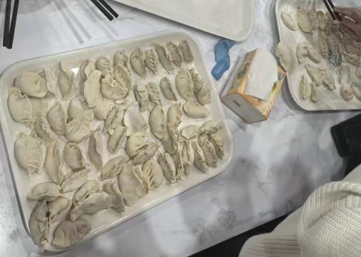 活動中,一場別開生面的包餃子環(huán)節(jié)將氣氛推向高潮。餃子作為中華傳統(tǒng)飲食文化的重要象征,承載著團(tuán)圓與美好祝愿。老師們親自上手,手把手教留學(xué)生們包餃子。從搟面皮、放餡料,到捏褶子,每一個步驟都充滿了樂趣。留學(xué)生們積極參與,盡管手法有生疏又熟練,但都樂在其中。有的包出的餃子形狀各異,充滿創(chuàng)意;有的同學(xué)則包得有模有樣,令人稱贊。手藝稍好的同學(xué)還主動當(dāng)起了“小老師”,耐心指導(dǎo)身邊的小伙伴,在一來一往的交流互動中,大家的情誼愈發(fā)深厚。