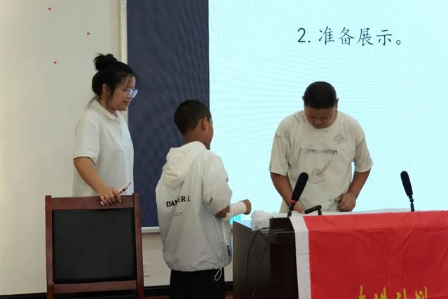 進(jìn)行一系列講解之后,現(xiàn)場還進(jìn)行了小朋友們的實(shí)踐操作展示環(huán)節(jié)。同學(xué)們兩人一組,一人扮演包扎員,一人扮演手臂受傷的傷員,在小老師的指導(dǎo)下,復(fù)習(xí)剛才學(xué)習(xí)的包扎步驟,其他同學(xué)則認(rèn)真觀察,提出改進(jìn)建議,現(xiàn)場互動(dòng)積極。
