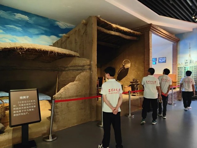 在“屯墾戍邊 瀚海紅星”展廳,展示著兵團人修建紅星渠時的場景復(fù)原與相關(guān)文物。70多年前,軍墾戰(zhàn)士們靠著頑強的意志和簡陋的工具,在鹽堿荒灘上開山炸石、鋪渠引水,將荒漠變成綠洲。講解員講述著當年戰(zhàn)士們克服重重困難,不畏嚴寒酷暑,日夜奮戰(zhàn)在水利建設(shè)一線的事跡,讓團隊成員為之動容。