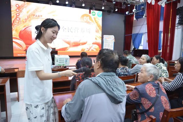 2025年7月16日上午11點(diǎn),“健康中國(guó),營(yíng)養(yǎng)先行”主題宣講率先拉開帷幕。團(tuán)隊(duì)以精心設(shè)計(jì)的模塊化課程體系,將抽象理論轉(zhuǎn)化為可觸達(dá)的生活指南。從2025年全民營(yíng)養(yǎng)周的深層內(nèi)涵,到“吃動(dòng)平衡”的生理學(xué)基礎(chǔ);從科學(xué)減重的階梯式路徑,到體重控制中高頻誤區(qū)的精準(zhǔn)拆解——宣講成員以邏輯鏈條清晰的表述層層推進(jìn)。互動(dòng)環(huán)節(jié)更是掀起高潮,針對(duì)“不吃主食能否減肥”“局部減脂可行性”等疑問,隊(duì)員結(jié)合代謝原理逐一破除迷思臨近結(jié)束時(shí),宣講成員還開展了知識(shí)競(jìng)答活動(dòng),居民們爭(zhēng)相舉手搶答,當(dāng)居民看向競(jìng)答贏得的紙巾與膳食手賬時(shí),營(yíng)養(yǎng)管理的種子已悄然扎根。