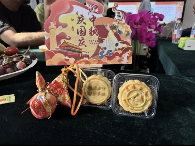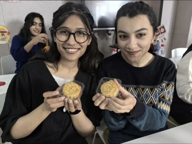 活動在“品月餅話中秋” 環(huán)節(jié)達(dá)到高潮。辦公室的老師精心準(zhǔn)備了印有石河子大學(xué)校徽以及校訓(xùn)的定制月餅,這些月餅都是五仁、蓮蓉、豆沙、蛋黃等傳統(tǒng)口味。當(dāng)這份帶著學(xué)校印記的中秋禮物被端上桌時(shí),現(xiàn)場瞬間響起陣陣驚嘆,尤其是2024 級的留學(xué)生們,大多是第一次品嘗月餅,這份“專屬感” 讓他們格外驚喜。來自尼日利亞的ELIZABETH小心翼翼拿起印有校徽的月餅,反復(fù)端詳后笑著說:“這是我第一次吃月餅,沒想到還有學(xué)校的標(biāo)志,感覺就像收到了來自‘第二故鄉(xiāng)’的中秋祝福,特別溫暖!”