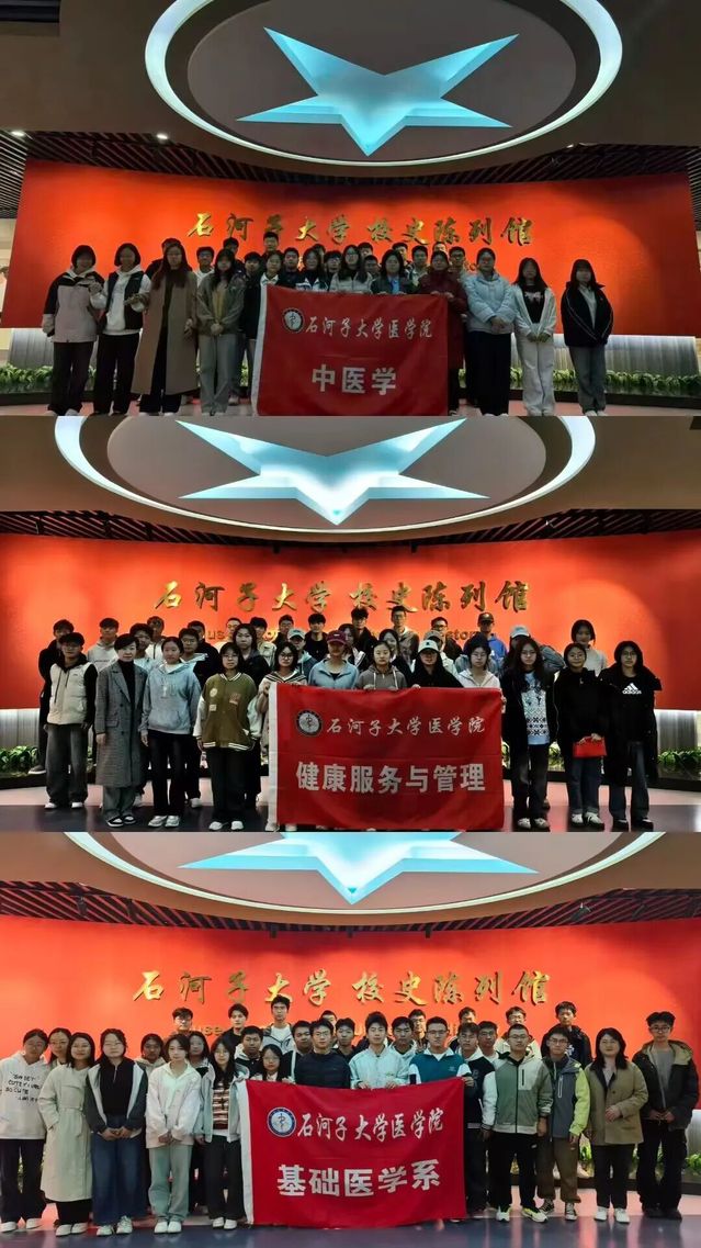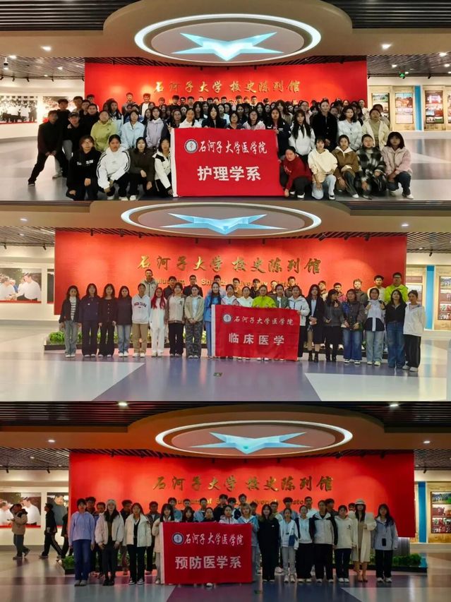 參觀的尾聲,是定格于鏡頭的嶄新起點(diǎn)。醫(yī)學(xué)院各系學(xué)子在館前依次合影。紅色的橫幅如旗幟般展開,映襯著一張張年輕而自信的面龐。他們不僅是來(lái)聆聽歷史的訪客,更是石河子大學(xué)精神在新時(shí)代的具象化身。
