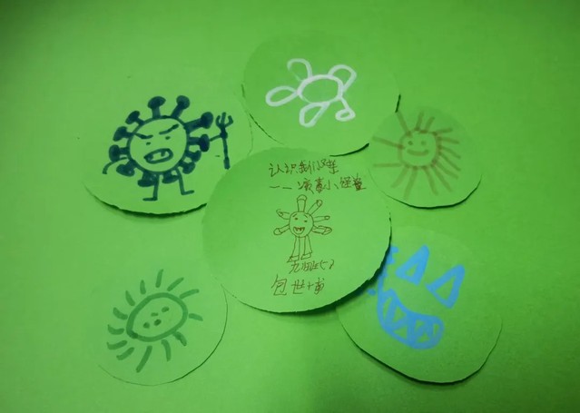 科普過程,志愿者給孩子們發(fā)放了小圓紙片,開展“圓紙片里的健康小世界”創(chuàng)意活動。綠色圓紙片上,很快填滿童趣筆觸:有的孩子畫出皺著眉頭、舉著小叉子的“憤怒病毒小怪獸”,把“需防范的病菌”具象為鮮活形象;有的畫下笑眼彎彎的太陽,用暖色調(diào)勾勒“健康狀態(tài)”的直觀感知;還有孩子寫下“認識我們班——病毒小怪獸”的稚嫩字跡,以自己的方式記錄下了這次別開生面的科普記憶。
