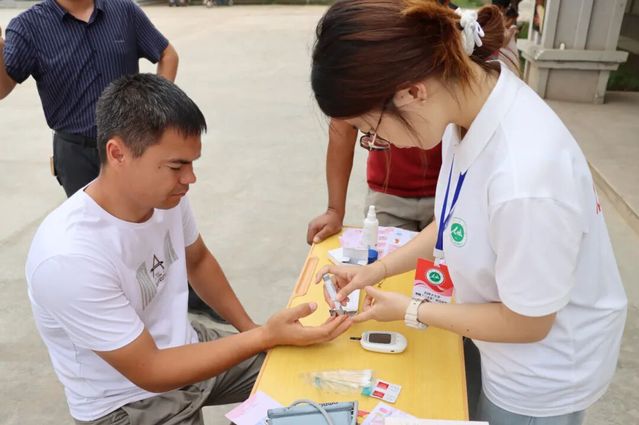 宣講結(jié)束后,健康服務(wù)環(huán)節(jié)隨即展開(kāi)。實(shí)踐團(tuán)成員迅速分成血壓測(cè)量組和血糖檢測(cè)組,有條不紊地為老人們提供服務(wù)。在血壓測(cè)量點(diǎn),實(shí)踐團(tuán)的成員們耐心地為每位老人纏上袖帶,調(diào)整坐姿,“奶奶,咱們放松一點(diǎn),測(cè)量時(shí)不要說(shuō)話喔”,一邊操作一邊叮囑,測(cè)量結(jié)束后還配合連隊(duì)衛(wèi)生員在登記表上認(rèn)真記錄數(shù)據(jù),并標(biāo)注注意事項(xiàng)。血糖檢測(cè)組時(shí),成員們發(fā)現(xiàn)一位阿姨餐后血糖高達(dá)21mmol/L,遠(yuǎn)超餐后2小時(shí)血糖低于7.8mmol/L的正常標(biāo)準(zhǔn)。經(jīng)了解,這位阿姨患有糖尿病卻疏于管理,日常飲食未加控制。在實(shí)踐團(tuán)成員和連隊(duì)工作人員的耐心勸說(shuō)下,阿姨最終被及時(shí)轉(zhuǎn)運(yùn)至團(tuán)部醫(yī)院接受進(jìn)一步治療,并下定決心今后將嚴(yán)格管控飲食,避免病情加重。