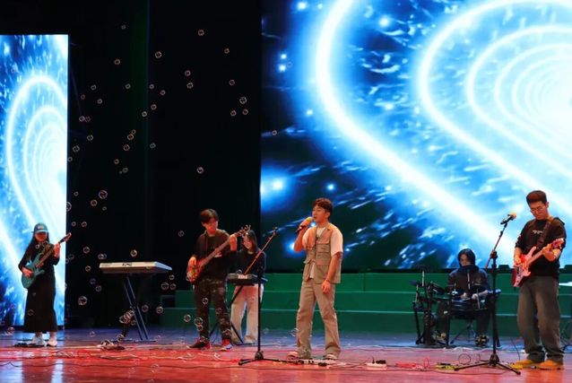 沖浪吉他社與大學(xué)生藝術(shù)團(tuán)IMP樂團(tuán)聯(lián)袂獻(xiàn)上樂隊(duì)表演《戀愛預(yù)謀ing》,前者以輕快的節(jié)奏點(diǎn)燃青春的激情,后者則巧妙改編經(jīng)典,帶領(lǐng)觀眾進(jìn)行一場(chǎng)穿越時(shí)空的音樂旅行。