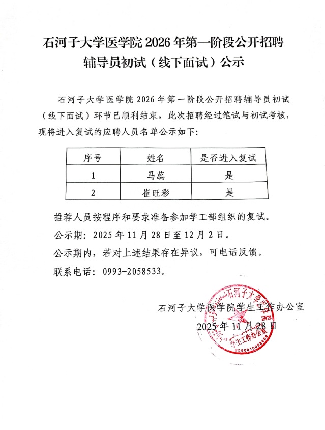 石河子大學(xué)醫(yī)學(xué)院2026年第一階段公開招聘輔導(dǎo)員初試( 線下面試)公示